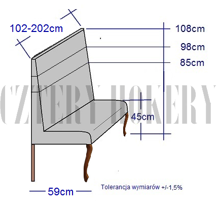 Wysokość całkowita: 70 cm / 85 cm / 98 cm / 108 cm / 130 cm Szerokość: od 102 cm do 202 cm (mebel na zamówienie) Głębokość całkowita: ławka o wys. całkowitej 70 cm — około 55 cm ławka o wys. całkowitej 85 cm — około 56 cm ławka o wys. całkowitej 98 cm — około 59 cm ławka o wys. całkowitej 108 cm — około 62 cm ławka o wys. całkowitej 130 cm — około 77 cm Odległość między nogami przednimi a tylnymi 55 cm Wysokość do podłokietnika 66 cm Wysokość do siedziska 48 cm Głębokość siedziska 45 cm |